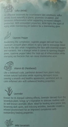 - Cayenne Pepper- Derived from plants of which its purpose is to encourage blood flow to the skin while invigorating the face with essential oxygen and nutrients.